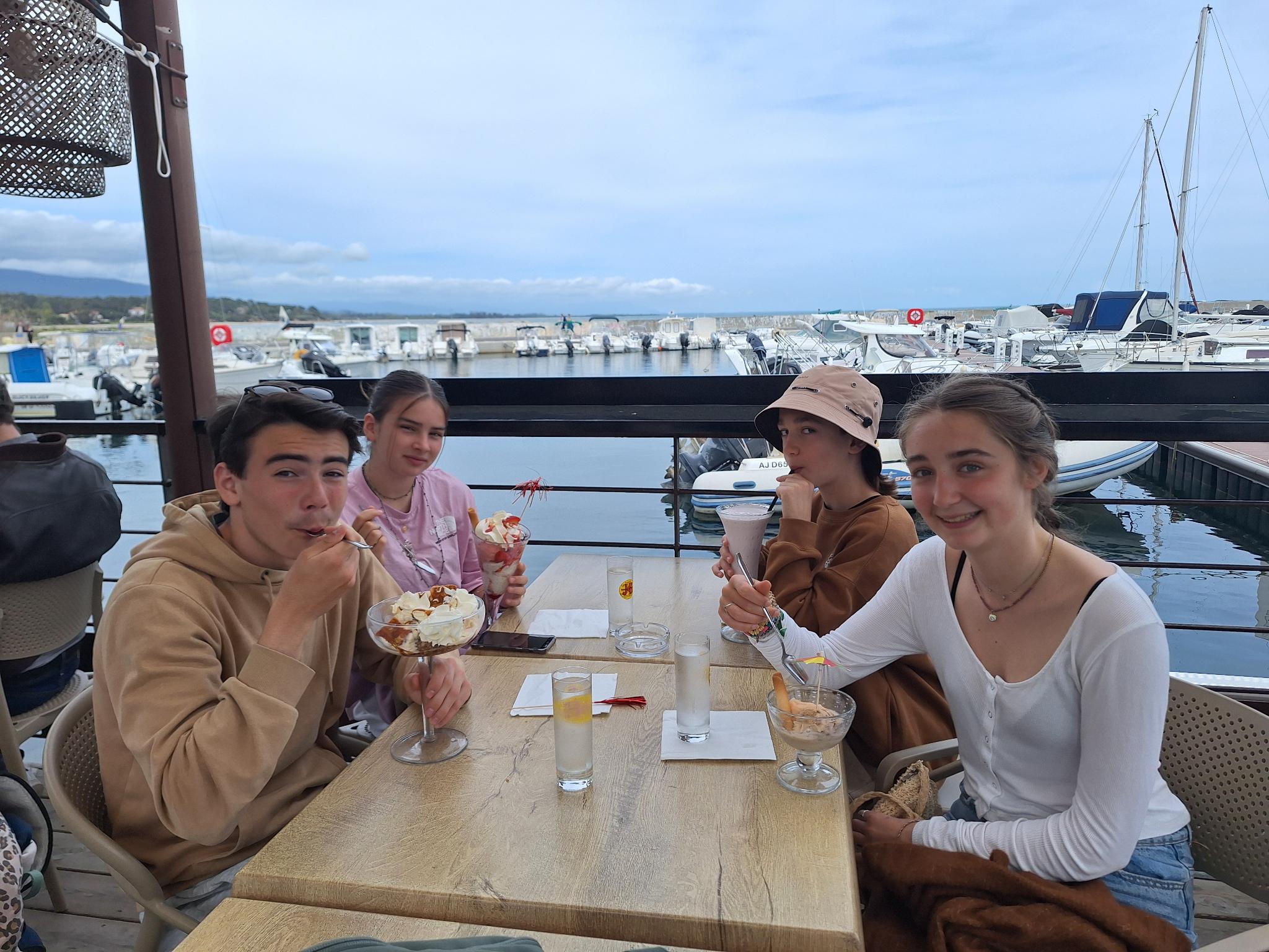 Nous sommes partis tous ensemble vers une petite ville Solenzara au nord, pour prendre une glace et se dire au revoir. Chacun a pris des parfums originaux type cacao, nepita, verveine, gingembre, etc. Amory et Lola ont pris des grosses coupes glacées, Gauthier et Ingrid ont pris des milshake.